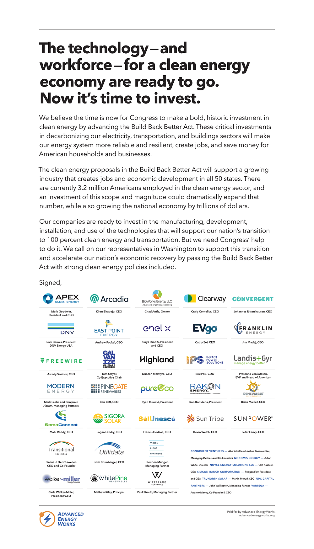 WASHINGTON, D.C., September 27, 2021 — In an open letter to Congress and the White House, business leaders from across the advanced energy industry are calling for the passage of the Build Back Better Act. The call to action was organized by national business association Advanced Energy Economy (AEE), in partnership with its affiliate organization Advanced Energy Works, which published the open letter online and in a full page ad in the Washington Post.