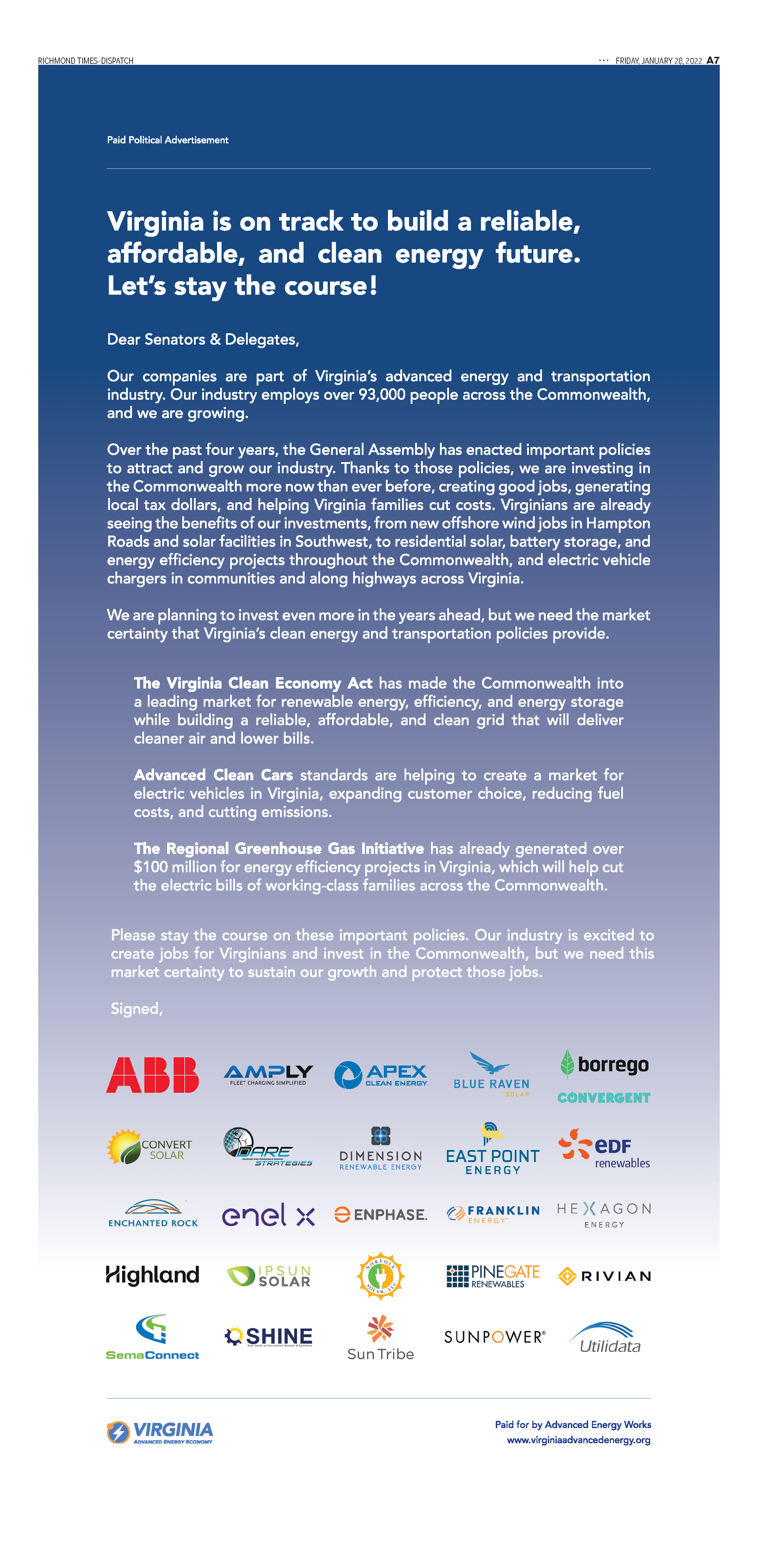 RICHMOND, January 28, 2022 — In an open letter to the members of the Virginia General Assembly, business leaders from across the advanced energy industry are calling on state Senators and Delegates to stay the course on creating a clean energy future for the Commonwealth. The call to action was organized by Virginia Advanced Energy Economy (Virginia AEE), in partnership with its affiliate organization Advanced Energy Works, which published the open letter online and in a full page ad in the Richmond Times-Dispatch on Friday.
