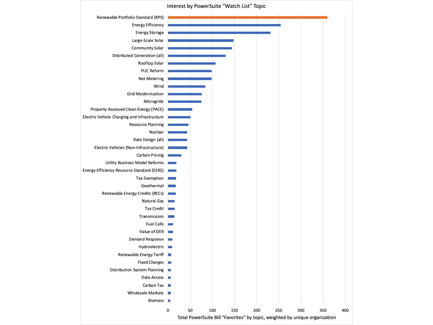In terms of legislation, bills related to “Renewable Portfolio Standards” (RPS) received the most “favorites” by PowerSuite users this year. When a topic (or a specific bill or docket) is marked as a “favorite,” the PowerSuite user receives an email notification with updates whenever there is new activity on the selected issue. (See Fig. 2 below.)