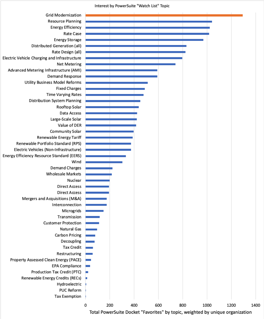 PowerSuite users indirectly show their interest in specific legislative and regulatory topics as well, based on what they are tracking as “favorites.” The PowerSuite team curates common energy policy topics into “watch lists” for easy reference. Among those watch lists, regulatory dockets categorized under “Grid Modernization” were favorited the most in 2018, followed by a cluster of others: resource planning, energy efficiency, and rate cases. (See Fig. 1 below.)